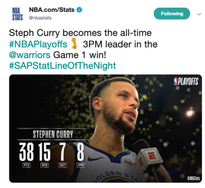 今天唯一主场取胜的球队,是卫冕冠军金州勇士。今天的比赛中,库里出战37分钟,16投11中,三分球12投8中,得到了38分15篮板7助攻的数据,比赛结束之后,NBA官方也将库里的表现,评选为今日NBA的最佳数据。