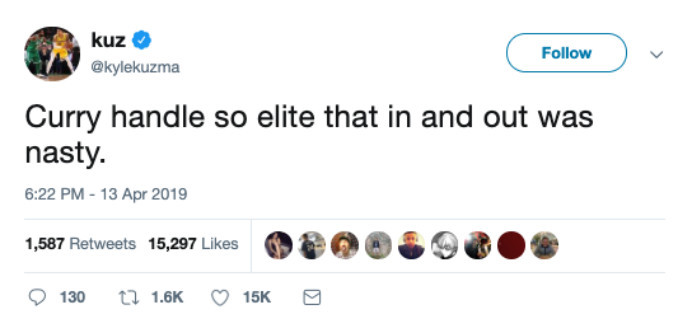 今天的比赛,库里确实打得非常骚气,比赛中,库里曾经有一个拜佛将对方晃起的画面,看到这样的进球,湖人球星库兹马也在感慨,库里的运球过人太精彩。