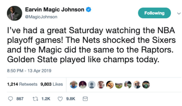 魔术师约翰逊也关注了今天的季后赛,在社交媒体上,他就评论称,“这个周六(当地时间),观看NBA的季后赛让我过的很好,篮网爆冷拿下了76人,而魔术也对猛龙做了一样的事情,勇士队今天的表现像总冠军。”