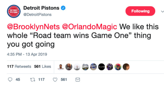 东部两支球队都完成了以下克上,这也给了活塞队一些信心。尽管他们将会对阵的,是联盟常规赛战绩第一的密尔沃基雄鹿。今天在社交媒体上,活塞官方就写道,“篮网还有魔术,我们要继续客场球队拿下系列赛第一场的传统。”