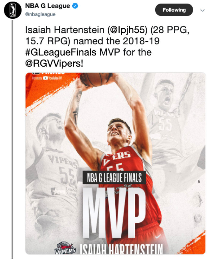 火箭队将会在明天开启季后赛的征程,他们的目标仍然是夺冠。值得一提的是,火箭的发展联盟附属球队毒蛇队,已经比火箭先拿到了冠军。而哈尔滕斯坦拿到了最终的总决赛MVP,发展联盟总决赛中,哈尔滕斯坦场均可以得到28分15.7个篮板。