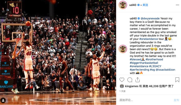 如今的韦德,已经结束了自己的职业生涯。如今,仍然有一些人,在回味韦德的退役告别战。今天在社交媒体上,队友哈斯勒姆就写道,“不管在我的生涯中,我达成一个什么样的成就,我永远都会记着,在你最后一舞征程的最后一场比赛中,命中的这个中距离,帮助你完成了三双的成就,没有比这更好的结束方式了。”