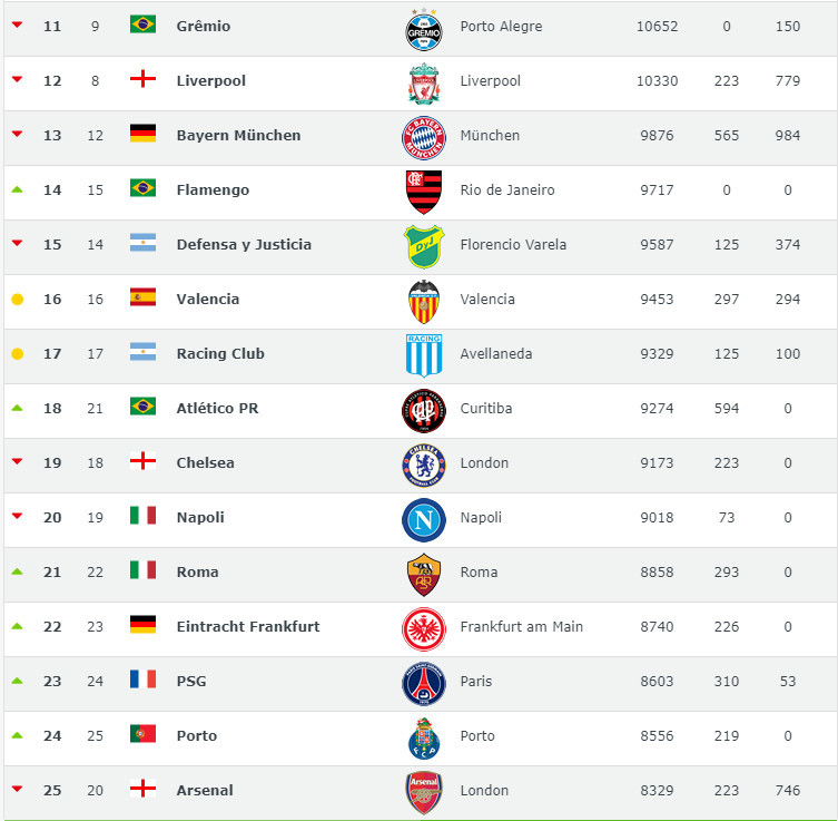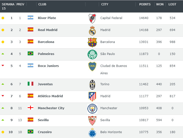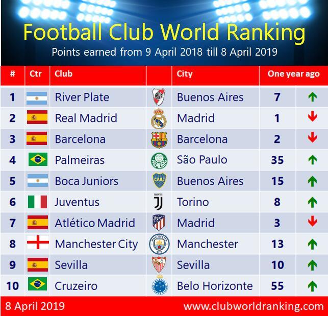 腾讯体育4月14日讯 近日,著名足球数据网站《clubworldranking》公布了2018年4月8日至2019年4月9日这一年以来的世界俱乐部排行榜,阿根廷超级联赛的河床队力压皇马巴萨等一众欧洲豪门排在榜首,皇马巴萨分列二三位,意甲领头羊尤文图斯上升一位排在第六,西甲第二马竞排名第七,英超豪门曼城上升三位进入前十排名第八。