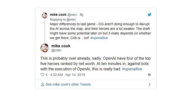 Mike Cook是一位狂热的Dota2玩家和观众,擅长人工智能和游戏设计的融合。他认为OpenAI Five打法激进,OG难以进攻,他特别注意到OpenAI Five能够充分搭配好英雄阵容。