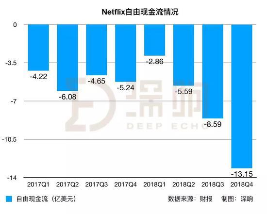 据Netflix2018年Q4财报,该季用户增长速度超出市场预期,盈利却出现两位数下滑,营收增速为去年四个季度中最低。从Q4自由现金流来看,由于该季有大量新的剧集上线,其数值为-13.15亿美元,而2017年同期为-5.238亿美元,同比增长了1.5倍。由此可见,对于Netflix来说,