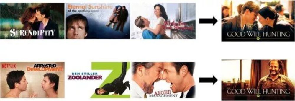 基于此,奈飞会把同一部影片中,不同用户截然不同的兴趣点以不同图片形式呈现出来,从而更好地吸引会员。如图中的《心灵捕手》,两位会员呈现的分别是爱情或其他主题。