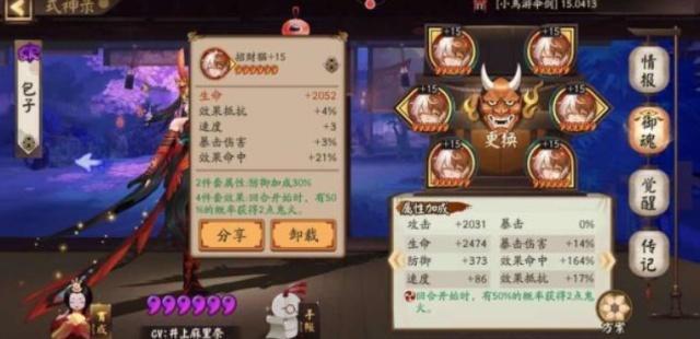 既然拥有164%的效果命中,其他的御魂自然也不会差到哪里,不过对于该痒痒鼠的御魂或许有一个缺陷,就是暴击为零。我们都知道凤凰火的大招拥有暴击特效,有几率刷星大招,所以一般的痒痒鼠们都会将凤凰火配上高命中满暴的御魂,但是嘛因为该痒痒鼠拥有这一套招财猫命中御魂,自然也是可以放弃暴击的。