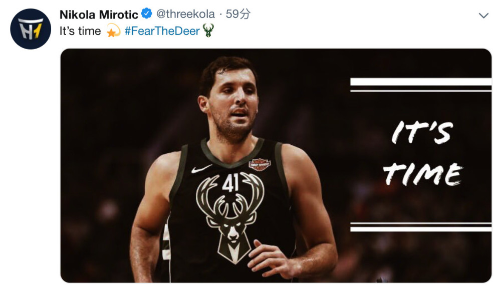 腾讯体育4月15日讯 雄鹿内线尼古拉-米罗蒂奇刚刚更新了自己的社媒账号,他在推特上发布了一张身披雄鹿球衣的照片,并配上了“是时候了”的文字。而这意味着此前备受伤病困扰的他很有可能将在季后赛首轮对阵活塞的首战中复出。