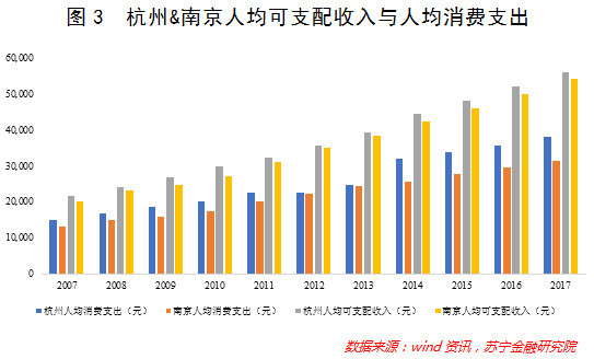 不过,严格意义上讲,人均GDP并不能充分反映居民生活状况,用人均可支配收入与支出相对更加贴切。在这两个指标上,杭州均领先于南京(参见图3),体现出杭州的经济发展质量更高,居民获得感更强。所以综合比较,杭州整体的经济实力还是要略强于南京。