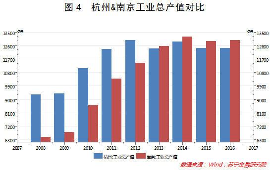 进一步对比两市的工业总产值,可以看到,南京于2013年超越杭州,此后便一直保持领先(参见图4),这要归因于南京发达的重工业与制造业。在实践中,南京的新能源汽车、新材料等先进制造领域一直表现颇为出色,并逐渐成为当地的主导产业。而教育部哲学社会科学重大课题攻关项目组发布的报告指出,南京在我国制造业十大强市之中位居榜首,印证了南京的实体经济更为扎实。