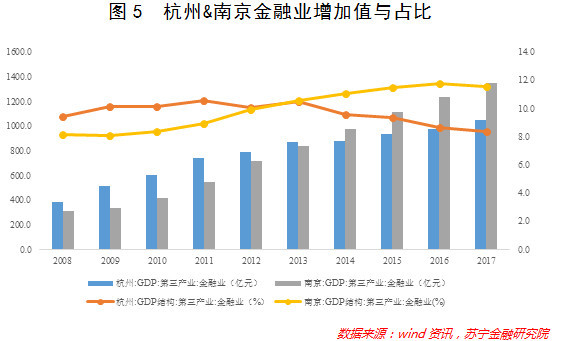 至于第三产业,可以选择具有代表性的金融与互联网两个领域加以讨论。于前者而言,2017年,南京金融业占GDP比重接近12%,要高于杭州的8%,且绝对规模上也在2014年之后保持领先(参见图5)。事实上,在中国(深圳)综合开发研究院发布的“中国金融中心指数”评估中,南京金融产业绩效排在国内城市第四位,仅次于北京、上海和深圳,实力可见一斑。