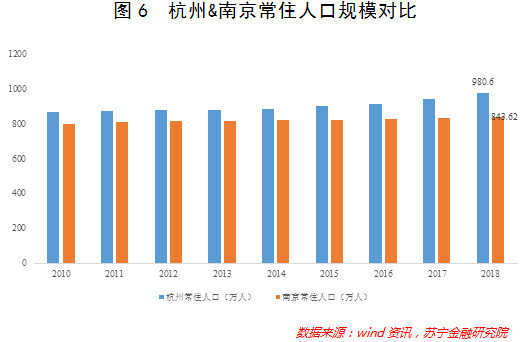 在经济活动中,人是最为重要的因素。从规模上看,2018年杭州与南京的常住人口分别为980.6万人与843.62万人,均达到“特大城市”标准(参见图6);同时,二者的人口规模大体上呈现出逐年递增态势,侧面反映出两个城市的经济活力之旺盛。