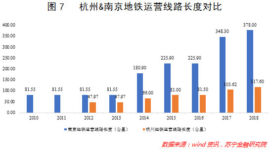 反观南京地铁,现已开通地铁运营线路10条,总里程达378公里(参见图7),线路总长居全国第四位(仅次于上海、北京、广州)。2018年,南京地铁日均客运量达到340万人次。至2030年,南京地铁规划建成25条地铁线路,总长1011.2公里。由此可见,南京拥有着更加完善的地铁网络,在缓解市内交通压力、构建城市公交网络方面产生了极大的效益。