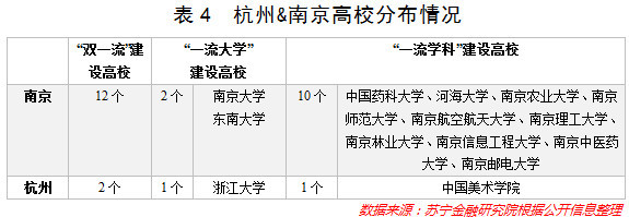 相比之下,南京是一个教育资源极其丰富的城市,211、985大学云集,其中不乏南京大学、东南大学这样的名校;在全国双一流大学排名中,南京仅次于“教育第一城”的北京(29所)和国际大都市上海(13所),以12所的数量排名全国第三位(参见表4),足以见得其科教实力之强悍。