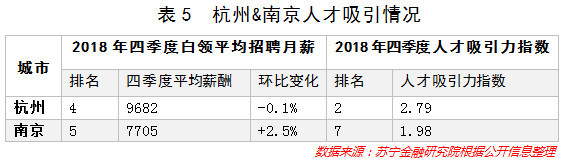 具体来看,根据互联网招聘平台BOSS直聘发布的《人才吸引力报告》,在薪资方面,2018年第四季度全国50城白领平均月薪为8317元,杭州平均招聘月薪逼近万元大关,南京排名紧随其后,但在绝对数值上要稍低于杭州;在人才吸引力指数方面,杭州为2.79,已经连续三个季度位居全国前两名,而南京则以1.98的成绩排名第七(参见表5),明显落后于杭州。