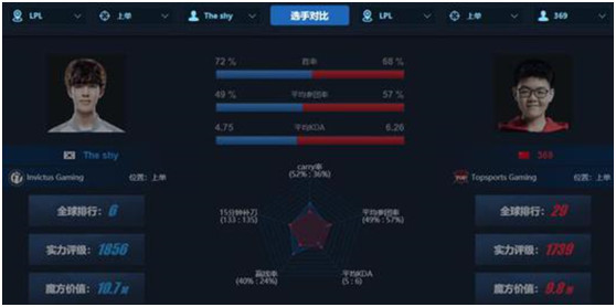 我们先来比较一下上单这位置,IG的Theshy和TOP的369两人数据。下图中,我们可以清楚地看到两名选手的各项数据。