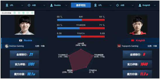 接下来看看中单位置的比较,Rookie是知名的韩籍选手,而黄金左手则是最受关注的国产中单,而光看数据两者差不多一样,五芒星几乎重合,不过两者还是有细微差别。从数据来看,黄金左手在参团率和补刀数上稍有领先,另外,在全球lol职业选手排名上,黄金左手位列世界第九领先Rookie第21位。