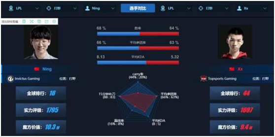 上单和中单两队选手都没有拉开明显差距,但在打野位上,TOP的Xx和IG宁王比起来还是有比较大的,首先是五芒星方面,Xx明显比不上宁王,在15分钟补刀和参团率上两者差距不大,但Carry率、KDA方面则是宁王大大领先。