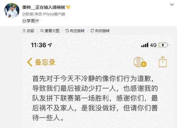 李帅写到:“首先对于今天不冷静的像你们行为道歉,导致我们最后被动少打一人。也感谢我的队友拼下联赛第一场胜利,感谢你们。最后祸不及家人,是我没做好,但请你们善待一些人。”