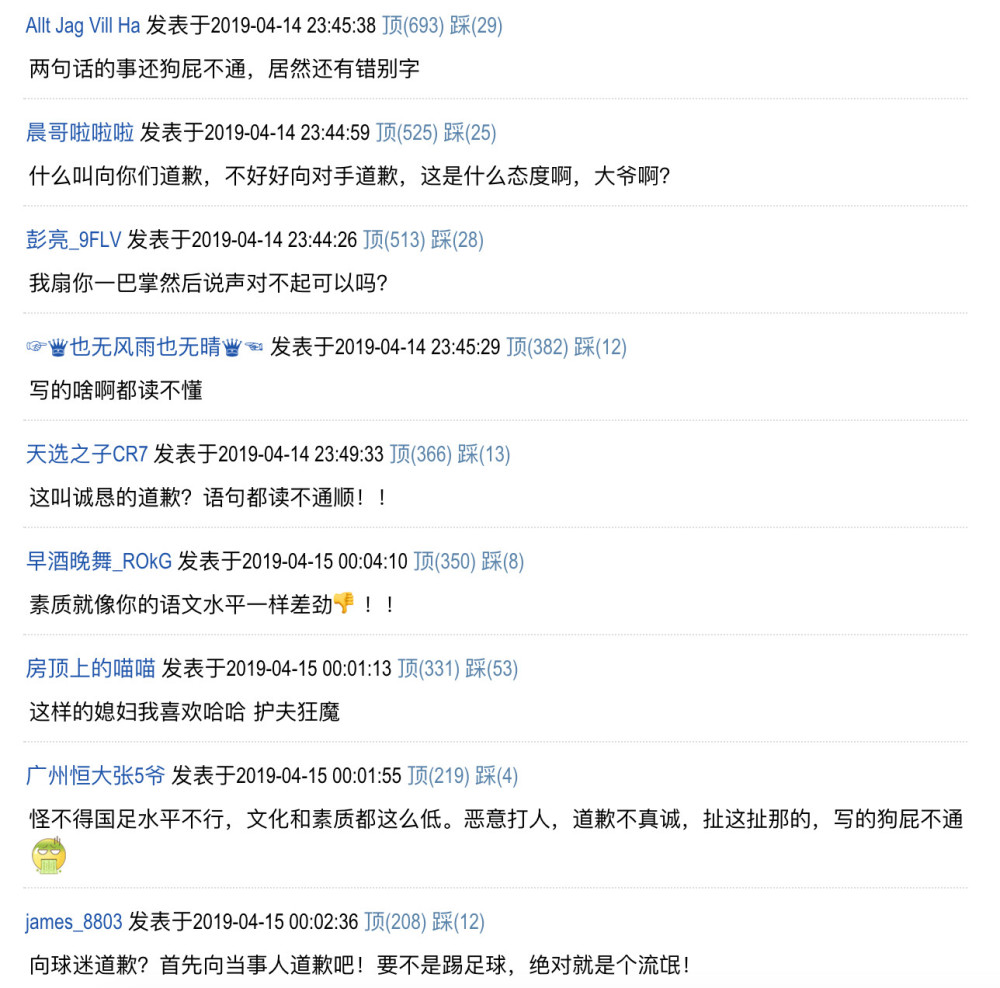 拿到3分太激动了?连一句话都表述不清楚了?球迷就吐槽到:“两句话的事还狗屁不通,居然还有错别字”“什么叫向你们道歉,不好好向对手道歉,这是什么态度啊,大爷啊?”“这叫诚恳的道歉?语句都读不通顺!!”“素质就像你的语文水平一样差劲”“怪不得国足水平不行,文化和素质都这么低。恶意打人,道歉不真诚,扯这扯那的,写的狗屁不通”!
