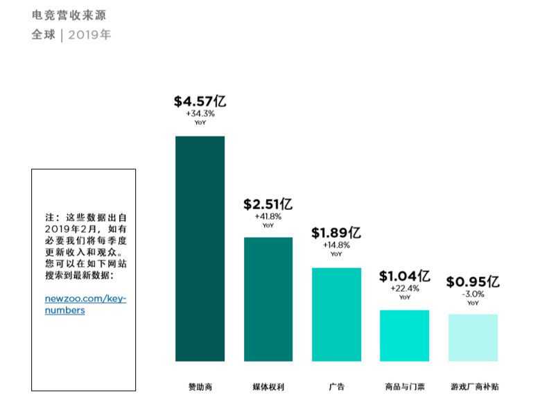 在Newzoo与生态圈联合发布的报告给出的数据中(运用体育产业收入计算模型来统计电竞产业收入),抛开了前端游戏厂商的“大头收入”,我们发现在这种模型下,2019年全球电竞产业收入达到11亿美元左右。
