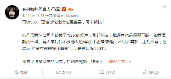 在其官方认证微博中,马云指出,“我们要听得进‘不中听’的话,更要有人敢于说‘不中听’的实话”,年轻人应该有机会听到真话。他表示,不为996辩护,但向奋斗者致敬。