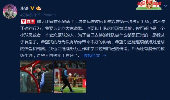 昨天比赛有点激动了,这是我做教练10年以来第一次被罚出场,这不是正确的行为,我要为此向大家道歉。也要和上港这位球童道歉,你可能也是一个小球员或者一个喜欢足球的人,为了自己支持的球队做什么都是正常的,是我过于着急了。希望我的行为没有给你带来不好的影响,希望你还能继续保持对足球的热爱和纯真。我也会继续努力工作和学会控制自己的情绪。后面还有漫长的教练生涯,希望不再被罚上看台了。