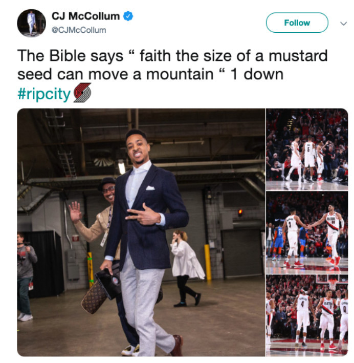 开拓者主场拿下了雷霆,这场比赛中,后卫麦科勒姆全场得到了24分6篮板3助攻。比赛结束之后,麦科勒姆晒出了球队今天的一些表现,然后写道,“圣经中说,‘如果我们怀有芥菜籽大小的信念,我们就能移动大山。’拿下第一场比赛。”