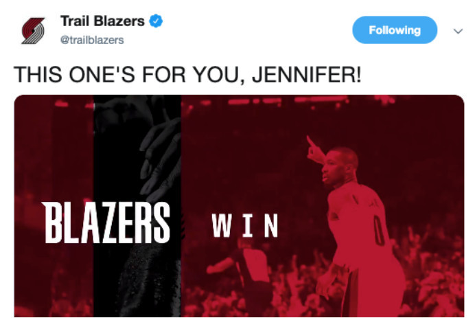 开拓者赢下比赛,球队官方发文,“这场胜利是为了詹妮弗。”不知道大家是否还记得,去年在一档节目中,麦科勒姆曾经表态,自己不会为了冠军加盟勇士,那太恶心了。随后一位名叫詹妮弗的球迷在麦科勒姆的社交媒体下面留言,“你先赢下一场季后赛的比赛吧。”当时,麦科勒姆回应称,“我在努力,詹妮弗。”当时,麦科勒姆的这句话,甚至成为了流行语,显然的是,一年之后,开拓者的球迷们,并没忘记这个梗。