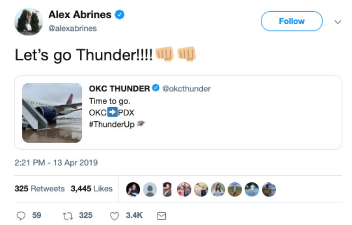 虽然如今已经不是雷霆队的一员,但阿布里内斯仍然支持着球队。今天的比赛开始之前,阿布里内斯就在社交媒体上写道,“加油,雷霆。”