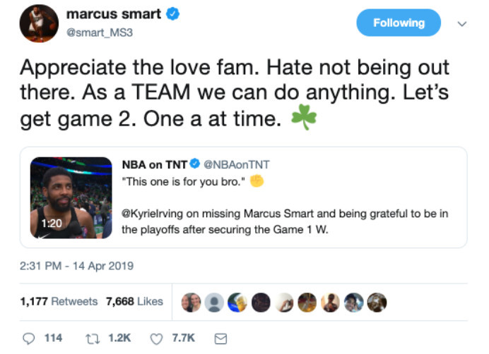 因为伤病的问题,后卫斯马特今天没有出战。比赛结束之后,欧文表示自己非常想念斯马特。而斯马特转发了欧文的采访视频,然后写道,“感谢这个爱的大家庭,不能够出现在那里真的很讨厌,作为一个团队,我们可以做到任何事情,让我们拿下第二场比赛吧。”