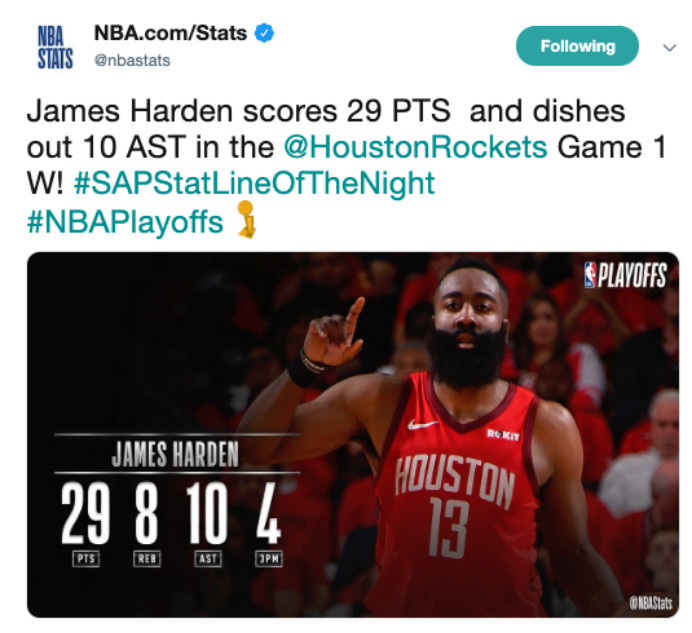 火箭今天轻松战胜了犹他爵士,这场比赛中,詹姆斯-哈登全场出战33分钟,26投11中,三分球10投4中,得到了29分8篮板10助攻的数据,比赛结束之后,NBA官方也将哈登的表现,评选为今日NBA的最佳数据。季后赛第一场,哈登和阿德托昆博都有着非常不错的表现,两人也都是常规赛MVP有利的争夺者,大家觉得,雄鹿火箭有多大可能在总决赛碰面。