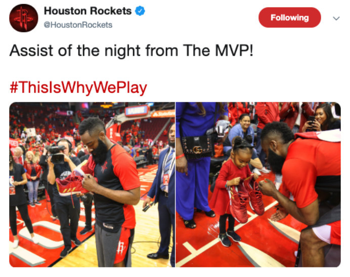 比赛结束之后,哈登将自己的战靴,送给了场边的一位小球迷,而在社交媒体上,火箭官方晒出了哈登送礼物时候的照片。