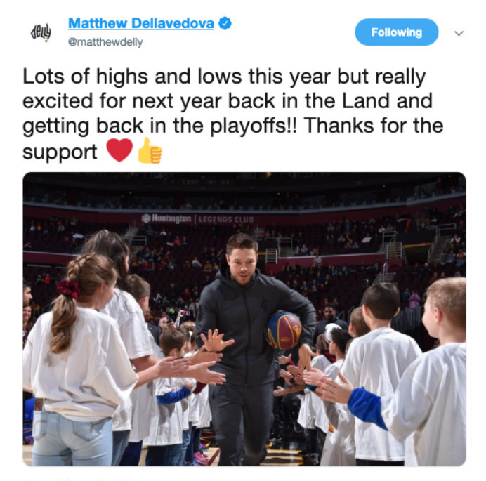 骑士后卫德拉维多瓦也早早结束了这个赛季的比赛,今天在社交媒体上,德拉就写道,“这一年,经历了很多的高潮还有低谷,但真的很兴奋,期待下个赛季回到这里,回到季后赛中,感谢大家的支持。”