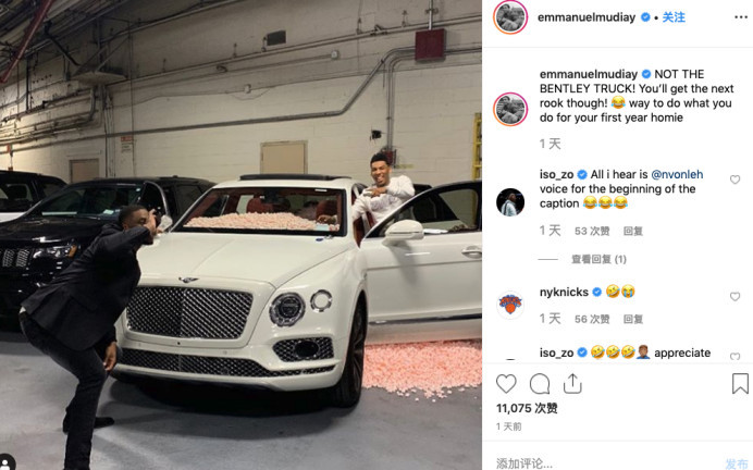 虽然赛季结束,但整蛊新秀的活动并没有结束。今天在社交媒体上,穆迪埃晒出了自己往新秀特里尔的宾利车中,塞满泡沫塑料的画面,然后写道,“不是这辆宾利被塞满,也会是下一辆的,这是你菜鸟赛季肯定会遭遇的。”