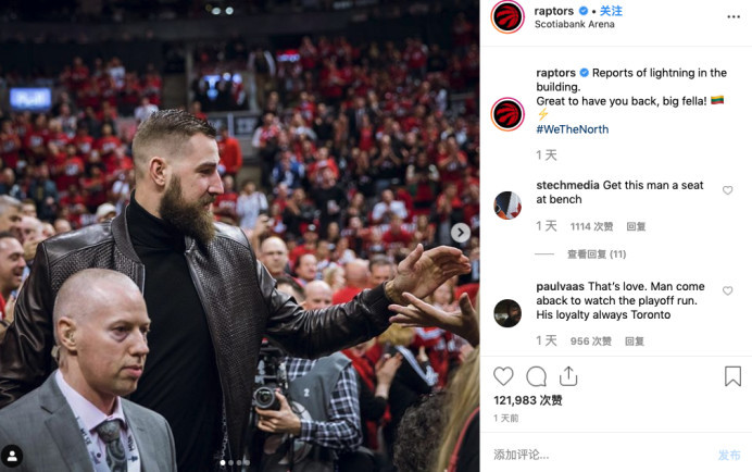 这个赛季中期,灰熊送走小加索尔,换来了瓦兰修纳斯。虽然如今已经成为灰熊队的一员,但瓦兰修纳斯仍然惦记着自己的前队友们,猛龙和魔术系列赛的第一场,瓦兰修纳斯就在场边观战。在社交媒体上,猛龙官方晒出了瓦兰修纳斯的照片在多伦多主场的画面。