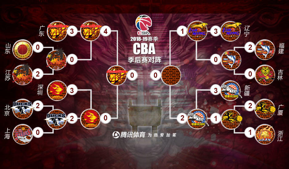 CBA季后赛对阵图腾讯体育4月15日讯2018-19CBA季后赛1/4决赛全部结束,随着深圳主场战胜北京完成系列赛惊天大逆转,本赛季CBA四强球队全部产生,分别是:广东、辽宁、新疆、深圳。4月15日,广东客场战胜深圳,系列赛总比分4-0横...
