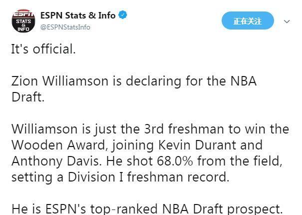 威廉森提前预定了2019年NBA选秀状元,其他球员只能争夺榜眼秀。