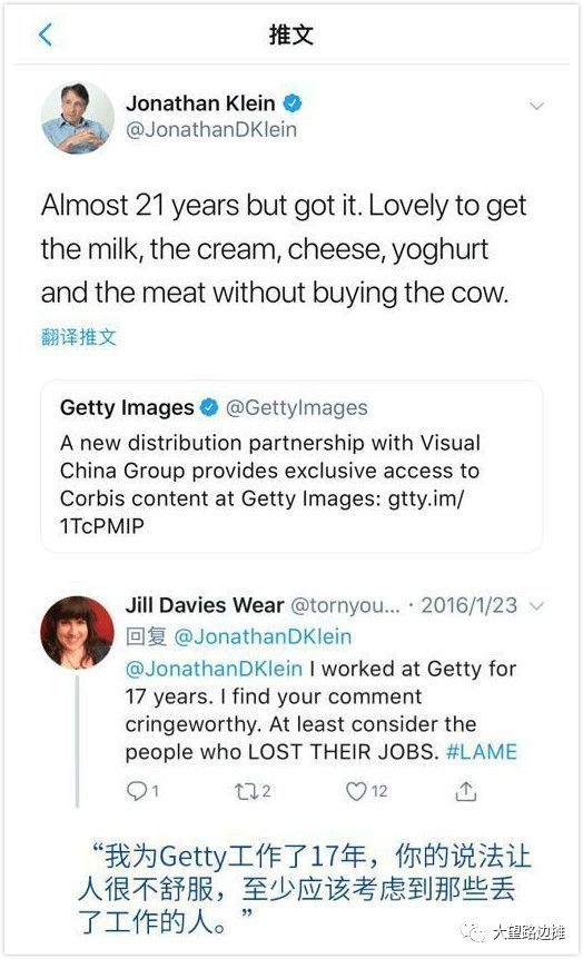 实际上,在视觉中国收购之后,Getty Images的创始人Jonathan Klein发出了一条Twitter: