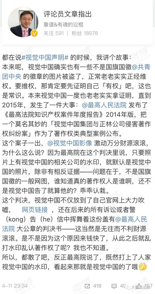 在4月11日深夜,有知情的法律界人士在微博爆料,说2014年视觉中国在一场图片版权诉讼案中反败为胜,最后被最高人民法院判赢并且作为《最高法院知识产权案件年度报告》中的著作权典型案例公布于世,这实际上成为了视觉中国“碰瓷维权”的尚方宝剑。
