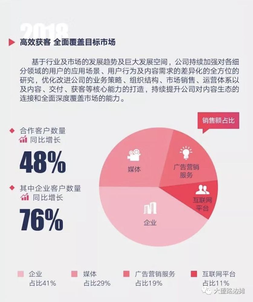 合作客户数量同比增长48,其中企业客户数量同比增长76%。在财报中,视觉中国特别提到了自己是“高效获客,全面覆盖目标市场”。