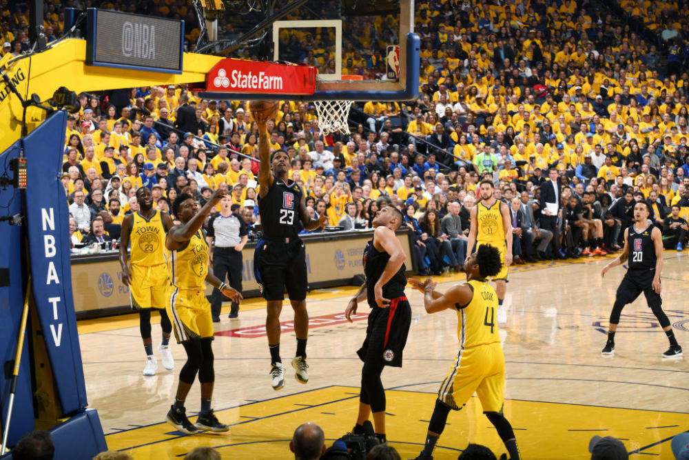 接着,路威持球展开攻击。快船所有球员都站定在外线,这让勇士的篮下空无一人。面对格林的错位防守,路威抓住机会轻松突破篮下。上篮不进后他又在人群中抢下篮板,第二次进攻打进。