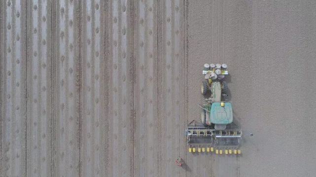 装有北斗自动驾驶导航系统的播种机在进行棉花播种 无人机航拍\郭雪伟摄