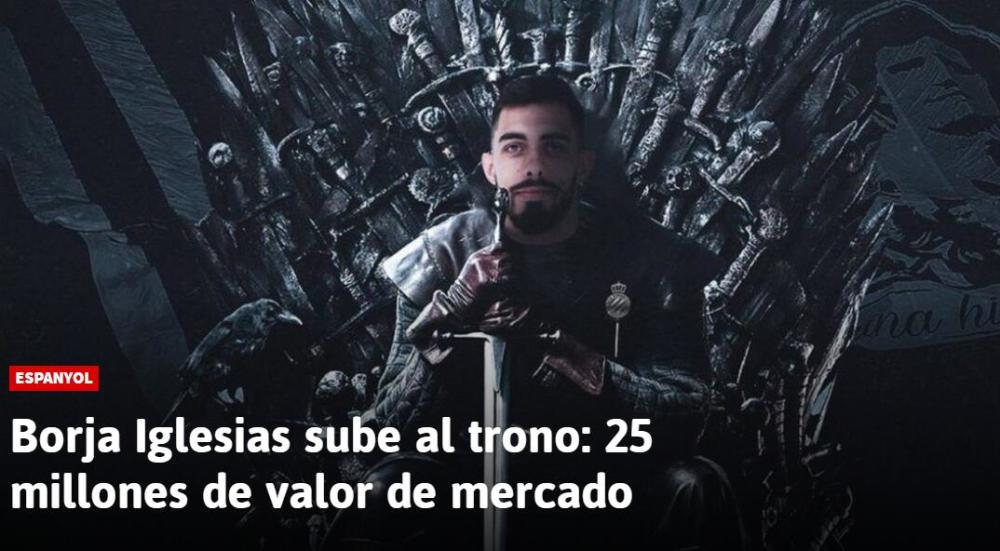 《阿斯报》这篇文章的配图,蹭了一下当前的热度,他们COS了《权利的游戏》剧照,他左胸位置的西班牙人队徽是皇冠造型,特别能应景。该报指出,伊格莱西亚斯的身价,蹿升的幅度非常具有魔幻色彩。