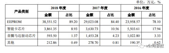 2016 年度、2017 年度和 2018 年度,聚辰半导体的营业收入分别为 3.07亿元、3.44亿元和 4.32亿元,净利润分别为0.35亿元、0.57亿元及1.03亿元。具体来看,EEPROM 在公司总营收中占比最高,近三年营收逐年增加,2018年该产品创收3.855亿元,占公司总营收89.2%。