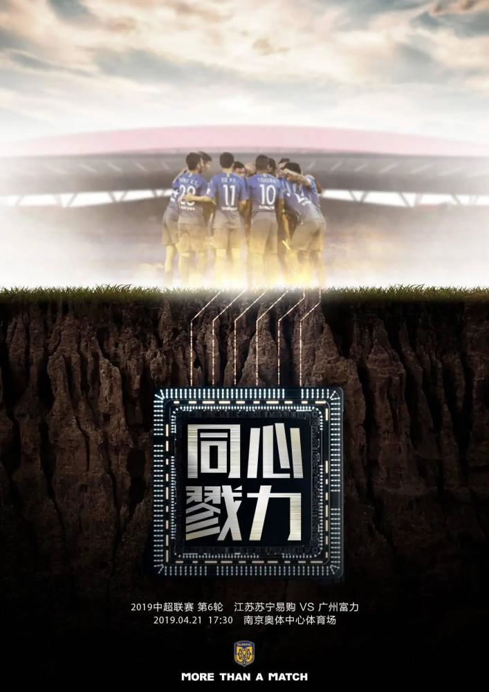 腾讯体育4月16日讯 江苏苏宁发布了2019年中超联赛第六轮对阵广州富力的比赛海报——同心戮力。4月21日晚17:30,江苏苏宁将坐镇主场奥体中心迎战广州富力队。【中超专题】