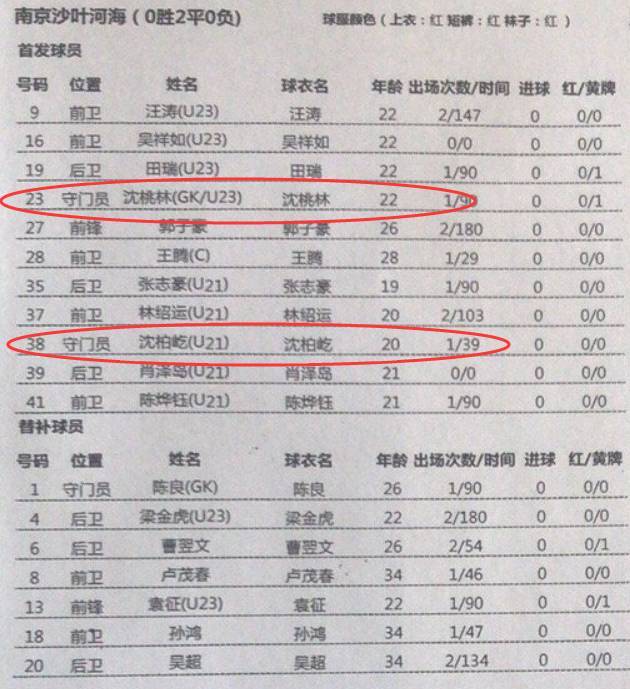 在南京沙叶河海队上交的首发名单中出现了两名门将!从以下的图片中可以看到,南京沙叶河海首发11人中的沈桃林和沈柏屹均显示为门将。而据南京沙叶河海的球队资料显示,沈柏屹平时所效力的位置是中场,这应该是上交首发名单时在位置填选上出现了乌龙,而不是没人踢让门将去踢别的位置。