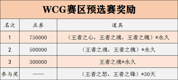 只要报名参加本次WCG预选赛的玩家,都将获得由主办方提供的王者之怒和王者之锋(30天),报名参赛即可领取,喜欢王者的玩家们可不要错过福利咯。