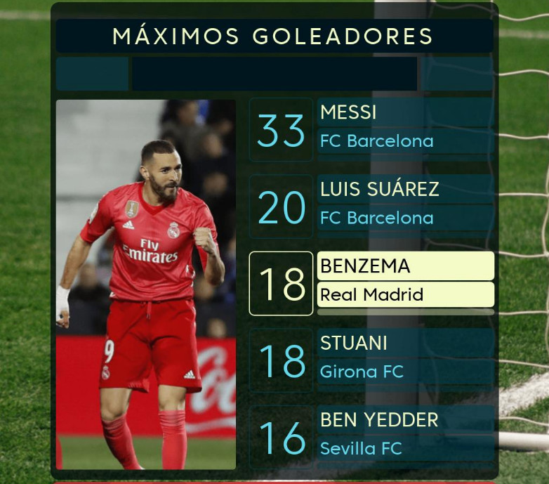 联赛斩获18球,本泽马追平斯图亚尼,并列西甲射手榜第3,距次席苏亚雷斯只差2球。韦斯卡、瓦伦西亚、埃瓦尔与莱加内斯,皇马连续4个对手,无一例外均被9号破门,是2016年4月后他首次连续4轮西甲建功,4战5球1助连造6球。上月末对垒韦斯卡62分钟塞瓦略斯破门后,皇马联赛近5球全由法国人一人包办,是其个人近8年最佳,上回连续包揽皇马5球远在2010-11赛季,而皇马上次有球员连续包办5球,还是2015年5月的C罗。
