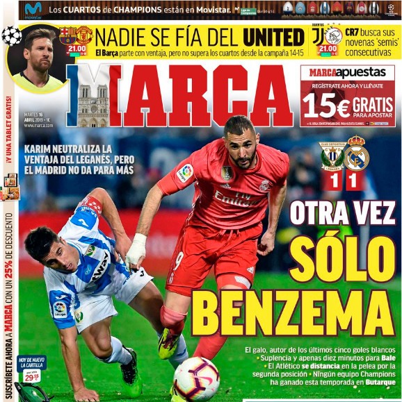 腾讯体育4月16日讯 近3年首次连续4轮西甲进球,近8年首次包办皇马连续5个进球,复制C罗壮举,本泽马状态火热,成4月全欧第一得分手。然正如《阿斯报》所言,光有个本泽马,皇马也只能避免失利,齐达内的球队似患上本泽马依赖症。【西甲联赛专题报道】